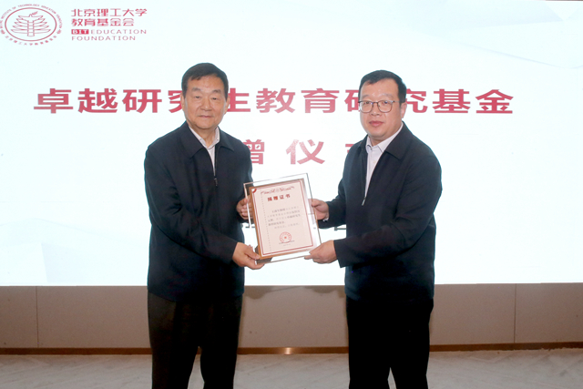 王战军回顾了在北理工求学和工作经历,表达了对学校的感激之情。他表示,作为北理工学子和教育事业的躬耕者,深刻体会到拔尖创新人才是国家竞争力的核心。此次捐赠设立卓越研究生教育研究基金,希望能够为学校学科建设、科学研究、人才培养等贡献绵薄之力。