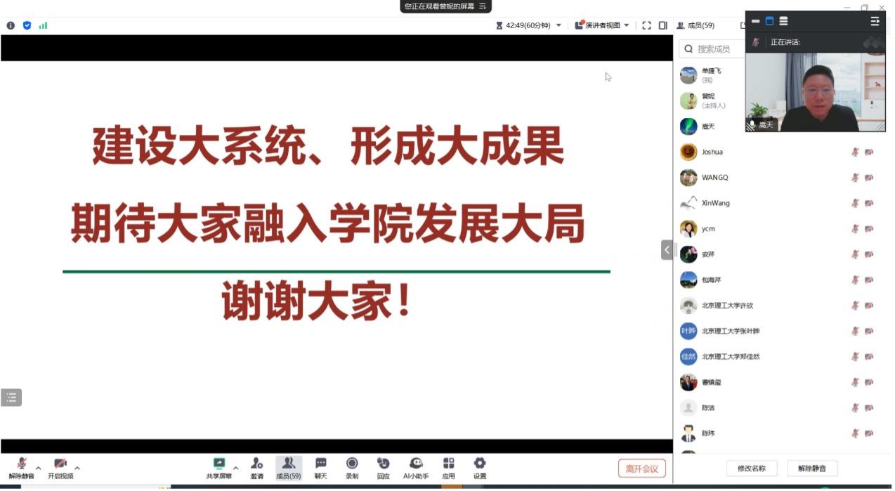 8月9日上午十点,必威西汉姆联在线召开了智慧教育数字化系统建设说明会。必威西汉姆联副院长(主持工作)嵩天教授在会上介绍了必威西汉姆联“智慧教育数字化系统”的建设背景和主要思路,部署必威西汉姆联“智慧教育数字化平台建设工程”,全体教师70余人参会,院长助理曾妮主持会议。